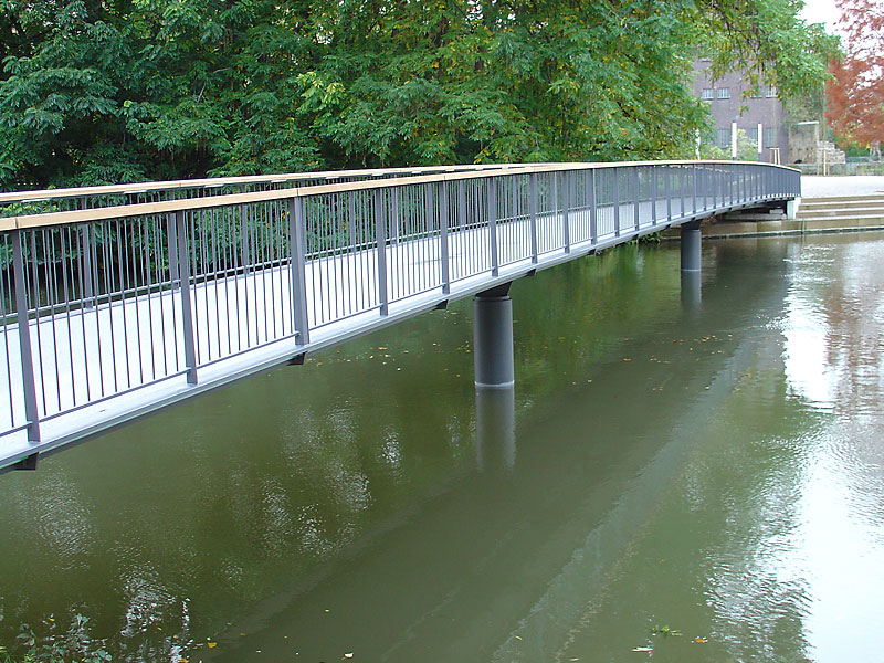 Footbridge overcrossing the river Altneckar in Heilbronn. The structure consist of two separate bridges with a total length of 52 m and 33,2 m respectively. The effective width is 3,0 m and the maximum single spans of the bridges are 18,0 m and 12,1 m respectively. One of the bridges consists of a movable mid span (9 m) which allows for boat traffic.