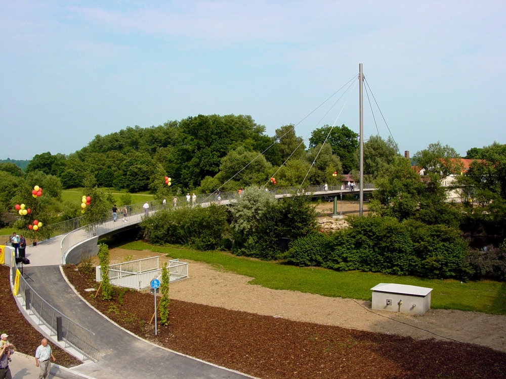 Footbridge with a total length of 140 m overcrossing the river Neckar. Main span 62 m, effective width 3,0 m. The walkway is built with an asymmetrical steel hollow section with a height of 50 cm. The girder (orthotropic steel section) is curved in the plan and supported on the inner side only. The height of the mast is 28 m.