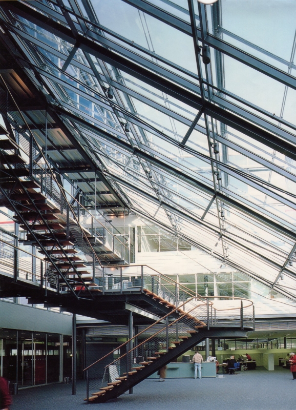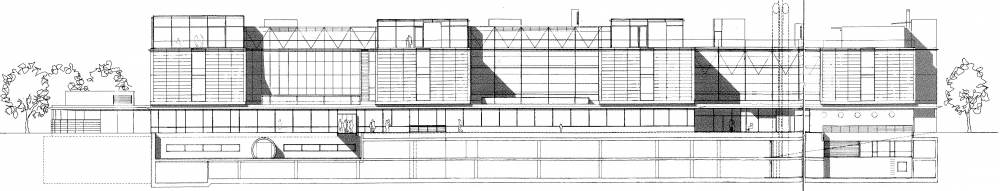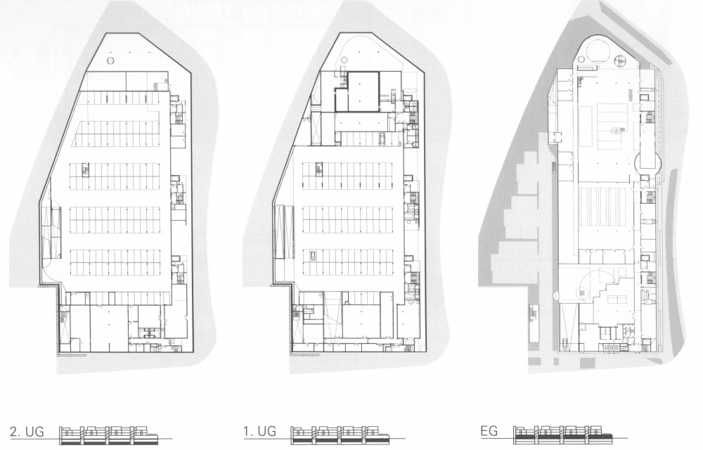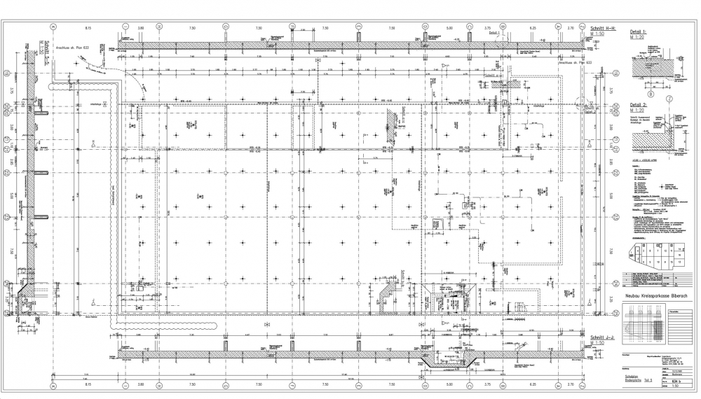 Verwaltungsgebäude mit 4 Büroriegeln sowie 2-geschossiger Tiefgarage mit 230 Stellplätzen. Untergeschosse für TG, Tresorräume und Technik auf ca. 6,0 m im Grundwasser in fugenloser Bauweise.