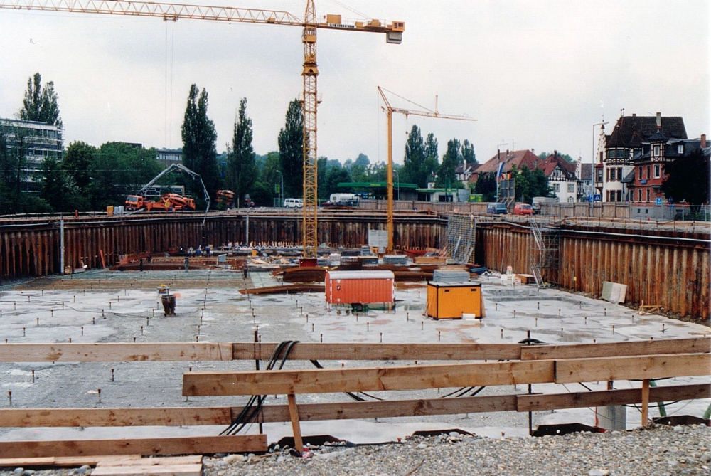 Mischbauweise aus Stahlbeton-, Stahl-, Stahlverbundbauteilen. Baugrube ca. 6.800 m² mit Spundwand und tiefliegender horizontaler Gel-Dichtungssohle, Auftriebssicherung des Gebäudes mit 330 Verpresspfählen.